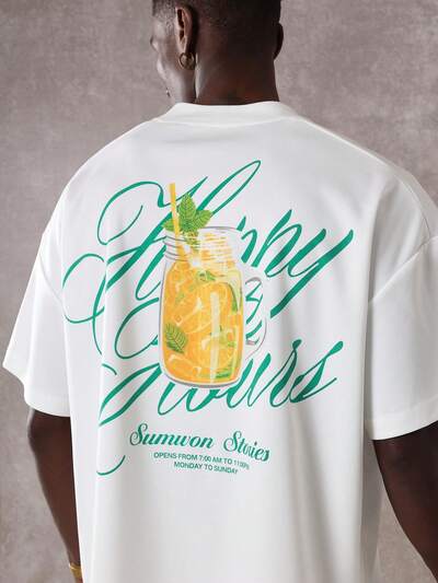SUMWON Casual Boxy Fit Summer T-Shirt With Orange Juice Mason Jar Print Opening Hours Streetwear Tee For All Day Leisure Activities