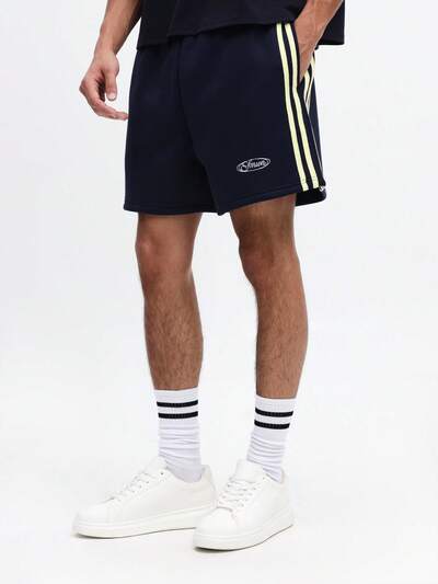 SUMWON Navy Athletic Shorts With Yellow Side Stripes And Logo Detail Men's Summer Casual Sportswear With Side Pockets