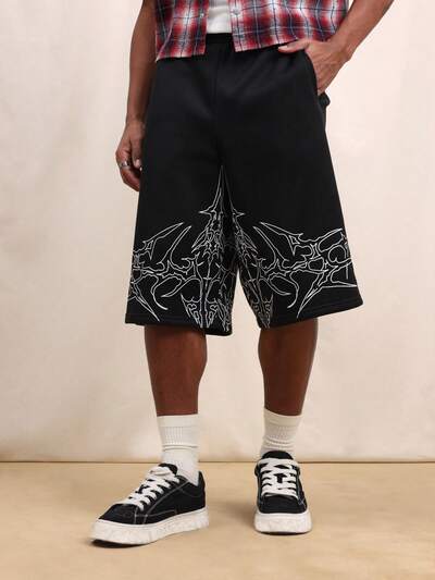 SUMWON Men's Black Baggy Jorts With White Graphic Print And Loose Fit For Summer Casual Street Style Wear