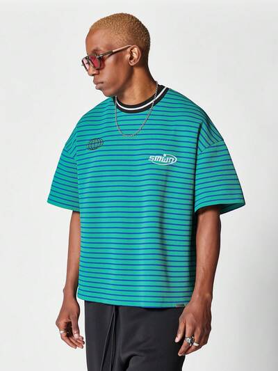 SUMWON Vintage Striped Oversized Y2K Streetwear T-Shirt St. Patrick's Day Lucky Charm Irish-Themed Casual Spring Summer Festival Globe Logo Retro Tee