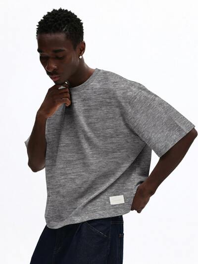 SUMWON Men's Heather Grey Essential Crew Neck Short Sleeve T-Shirt With Script Patch Detail Relaxed Fit Casual Everyday Cotton Tee