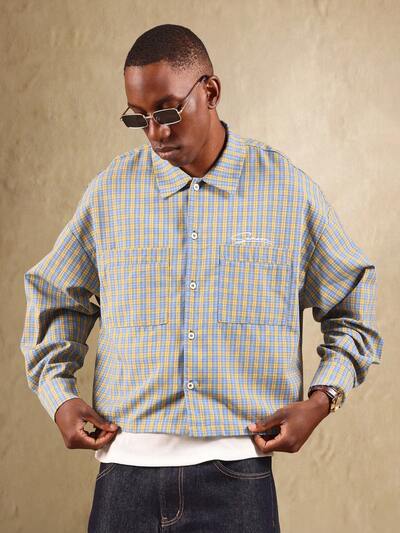 SUMWON Cropped Button Down Long Sleeve Plaid Shirt Relaxed Fit Drop Shoulder Casual Spring Cotton Top Street Style Fashion Flannel Shirt Modern Basics
