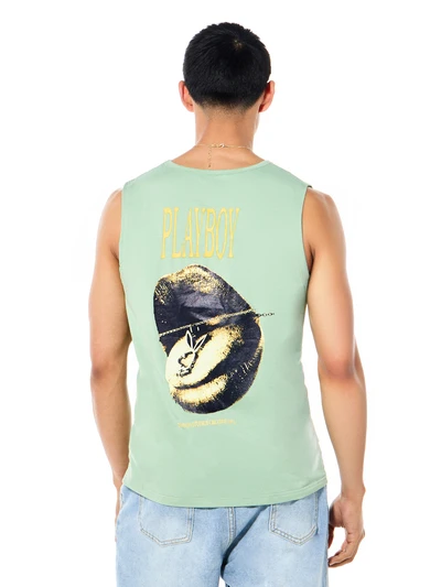 PLAYBOY X SUMWON Men's Regular Fit Sleeveless Tank Top With Script Logo Print Summer Casual Crew Neck Tee