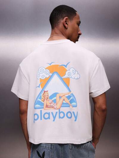 PLAYBOY X SUMWON Men Short Sleeve Crew Neck Cotton T-Shirt With Text Graphics Back Print Regular Fit Casual Tee