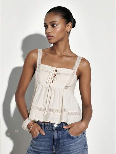 KSTM Boho Peasant Square Neck Lace Trim Camisole Top With Adjustable Ties Summer Festival Casual White Tank