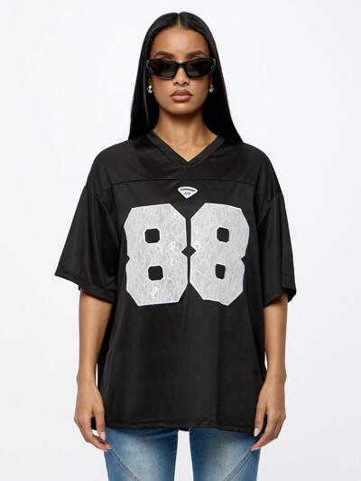SUMWON Varsity Trikot Stil T-Shirt mit Spitzen-Nummer-Muster, oversized Ausschnitt, Bekleidung für Herbst, Streetwear, Sportswear