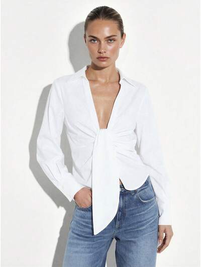 KSTM Damen Weiße Langarm Bluse mit Kragen, Knopfleiste und Drapierung, Klassisches Bürohemd für den Berufsalltag