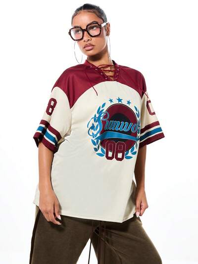 SUMWON Camiseta de fútbol con gráfico oversize, detalles de cordones, paneles de color block y mangas a rayas, Mundial