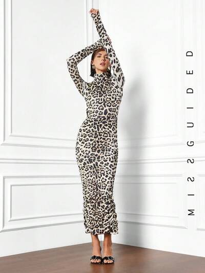 MISSGUIDED Robe longue moulante bandeau plissée sur le côté imprimé léopard, jolie robe d'été