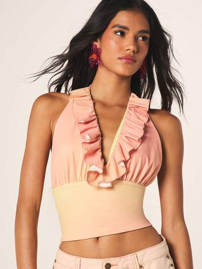 MISSGUIDED Top corto in seta con scollo a V profondo, dettagli con fiocco e volant sfumati, adatto per l'estate