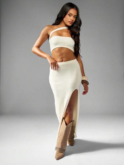 MISSGUIDED アシンメトリーワンショルダーデザイン ウエスタン バケーション ビーチパーティー フェスティバル 夏のイブニングアウトフィット ニットのクロップトップとマキシスカートのコーディネートセット