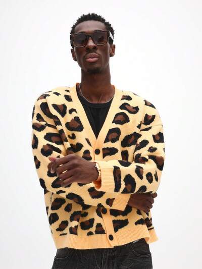 SUMWON Kardigan z nadrukiem w panterkę, zapinany z przodu na guziki, z prążkowanym wykończeniem, z długim rękawem