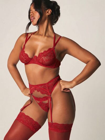 MISSGUIDED Conjunto de Lingerie de Renda Vermelha com Cinta-Liga, Meias, Sutiã Íntimo de Dia dos Namorados, Calcinha, Três Peças, Roupa de Dormir para Quarto