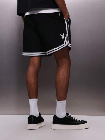 PLAYBOY X SUMWON Shorts Preta Masculina de Nylon com Recorte Contrastante Branco e Bolsos Laterais, Shorts de Basquete Casuais de Verão com Cintura Elástica